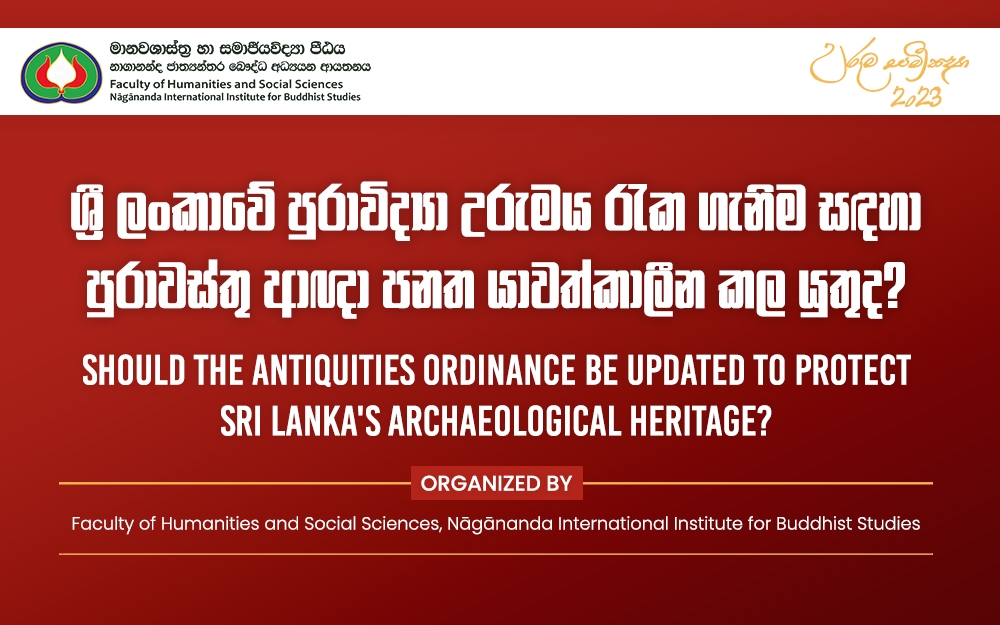 This Lecture will be held on National Archaeology Day at Uruma Samiksha 2023 of Nāgānanda International Institute for Buddhist Studies (NIIBS). The Faculty of Humanities and Social Sciences of Nāgānanda International Institute for Buddhist Studies (NIIBS) organized this lecture under the topic of Should the Antiquities Ordinance be updated to protect Sri Lanka’s archaeological heritage?